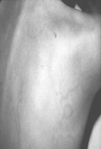 Высыпания имеют преходящий мигрирующий характер, не сопровождаются зудом и индурацией, не возвышаются над поверхностью кожи, бледнеют при надавливании, быстро исчезают под влиянием лечения и не оставляют после себя пигментацию, шелушение, атрофические изменения.
