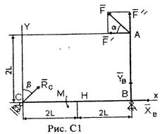 оси ХУ и изобразим действующие, на раму силы: силу F, пару сил с моментом М и реакции связей Хв, Vb, Rc (реакцию неподвижной шарнирной опоры В изображаем двумя ее составляющими, реакция шарнирной опоры на катках направлена перпендикулярно опорной плоскости. Составим три уравнения равновесия плоской системы сил. При вычислении момента силы F относительно точки В воспользуемся теоремой Вариньона, т. е. разложим силу F на составляющие F', F" (F'=F cos α, F" =F sin α) и учтем, что mв (F)= mв (F' )+ mв (F" ). Получим :