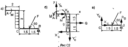 Рассмотрим равновесие отдельных участков рамы, разделив ее в шарнире С. При этом к левому участку рамы (рис С2,в) согласно аксиоме отбрасывания связей будут приложены силы реакции опоры В-Rв и реакция в шарнире С, которую разложим на две сое являющие Хс и Yс, а на правую (рис. С2,б) - реакции заделки: силы Ха и Yа, реактивный момент Ма, реакции шарнира С: Х/с и Y/с, модули которых равны Хс и Yс, а направление противоположно.