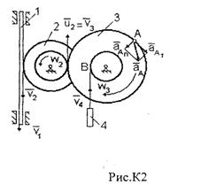 Пример К2. Рейка 1, ступенчатое колесо 2 с радиусами R2 и r2; и колесо 3 радиуса Rз, скрепленное с валом радиуса rз, находятся в зацеплении;