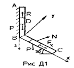 Пример Д1. На вертикальном участке АВ трубы (рис. Д1) на груз D массой m действуют сила тяжести R и постоянная сила Q; расстояние от точки А, где v = v0, до точки В равно l. На наклонном участке ВС на груз действуют сила тяжести и переменная сила F = F(t), заданная в ньютонах.