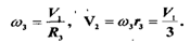 Так как рейка и колесо 2 находятся в зацеплении, то v2 = v1 или w2R2 = v1. Но колеса 2 и 3 тоже находятся в зацеплении, следовательно, u2 = vз или w2R2 = w3R3. Из этих равенств находим