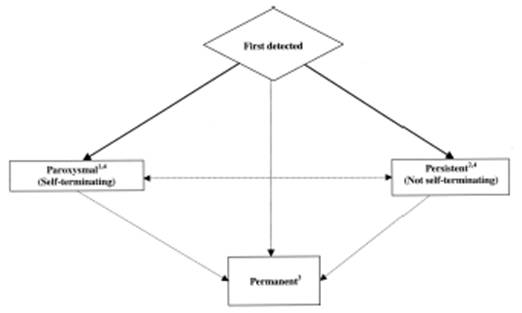 Для характеристики эпизодов МА рекомендуют использовать следующие определения (рис.1). “Впервые выявленный эпизод МА” – может быть как первым эпизодом МА различной длительности, так и очередным эпизодом в случаях, когда возникнование МА ранее было малосимптомным или бессимптомным. “Рецидивирующая МА” – наличие 2-х и более эпизодов МА. “Пароксизмальная МА” – аритмия прекращается спонтанно (обычно в течение £7 сут, чаще в первые 24-48 ч). “Персистирующая или устойчивая МА” – аритмия спонтанно не прекращается (для ее ликвидации требуется фармакологическая или электрическая кардиоверсия) и длится обычно более 7 сут. Данная форма МА может быть либо первым проявлением МА, либо явиться проявлением рецидивирующей МА. “Постоянная (хроническая) МА” – разновидность длительно существующей персистирующей МА, когда не было попыток кардиовесии или эти попытки были противопоказаны.