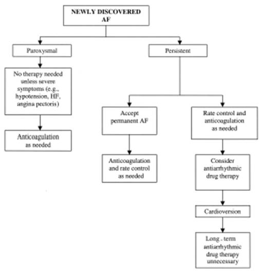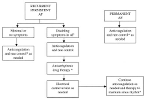 У больных с короткими эпизодами МА, которые проходят самостоятельно, антиаритмического лечения обычно не требуется за исключением случаев, когда появления МА сопровождается тяжелыми симптомами (гипотония, ишемия миокарда, сердечная недостаточность). Целесообразность применения антикоагулянтов не ясна и решение об их назначении следует принимать индивидуально с учетом наличия факторов риска тромбоэмболических осложнений. При персистирующей МА можно позволить ей перейти в постоянную форму, обеспечив надлежащий контроль ЧСС и антикоагулянтную терапию. Разумно предпринять по крайней мере 1 попытку восстановить и удержать синусовый ритм, однако решение должно приниматься индивидуально с учетом пользы от восстановления синусового ритма и риска побочных эффектов антиаритмической терапии. Перед кардиоверсией необходимо обеспечить контроль ЧСС и адекватную антикоагуляцию. Хотя длительная антиаритмическая терапия для предупреждения возобновления МА часто не требуется, может быть оправданным короткое лечение. Если МА существует более 3 мес, она часто возобновляется вскоре после кардиоверсии. Поэтому целесообразно назначить антиаритмик до кардиоверсии (после достижения адекватной антикоагуляции). Длительность антиаритмической терапии после восстановления синусового ритма может быть короткой (например, 1 мес).