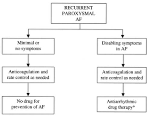 Больные с минимальными симптомами, подвергнутые по крайней мере 1 попытке восстановления синусового ритма, могут быть оставлены с МА после подбора терапии по контролю ЧСС и предупреждению тромбоэмболических осложнений. Если симптомы, возникающие при МА, свидетельствуют о предпочтительности удержания синусового ритма, до кардиоверсии в дополнение к препаратам для контроля ЧСС и антикоагулянтам следует назначить антиаритмический агент (критерии выбора те же, что и при повторяющихся пароксизмах МА; см. рисунок). В дальнейшем целесообразно продолжить прием антиаритмика для удержания синусового ритма.