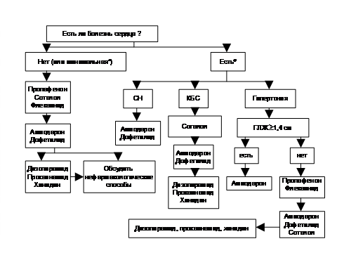 При коротких пароксизмах МА с минимальными симптомами разумно не использовать антиаритмическую терапию. Она обычно требуется, если появление МА сопровождается тяжелыми симптомами. В обеих ситуациях необходимы меры по контролю ЧСС и предупреждению тромбоэмболических осложнений. У многих больных могут быть эффективными различные антиаритмики и первоначальный выбор препарата должен основываться на соображениях безопасности (рис. 4). Подчеркивается, что данные рандомизированных исследований антиаритмических агентов при МА немногочисленны, рекомендации по выбору конкретного препарата основаны преимущественно на соглашении экспертов и при появлении новых фактов могут подвергнутся изменениям.