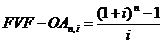 FVF–OAn, i – фактор будущей стоимости аннуитета постнумерандо п периодов при процентной ставке i, который рассчитывается по следующей формуле