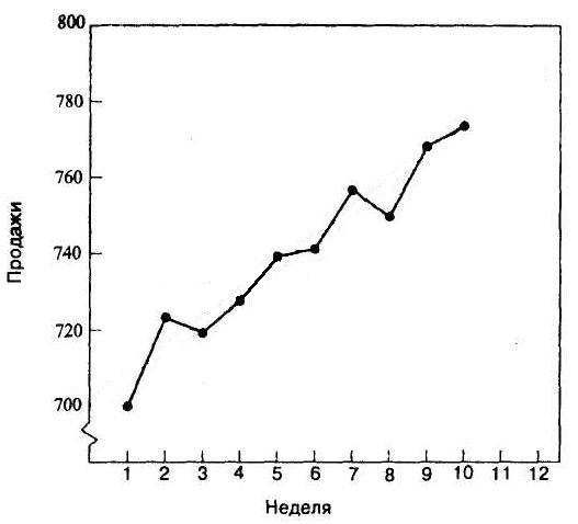 Следовательно прогноз на 11 неделю этим методом будет равен 783,58.