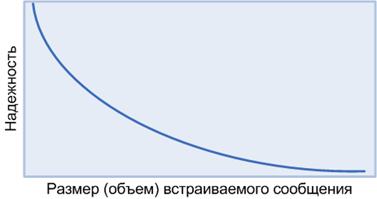 Но у всех трех направлениях стеганографии имеется ограничение. Для большинства современных методов, используемых для сокрытия сообщения в цифровых контейнерах, имеет место следующая зависимость надежности системы от объема встраиваемых данных (см. рис. 5.10):