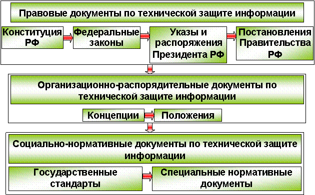 Чтобы разобраться в вопросах применения российских стандартов, необходимо представить себе административно-правовую структуру государственных органов, обеспечивающих информационную безопасность и понять, какое место они в ней занимают [5]. Эта структура показана на рис. 8.1, откуда видно, что стандарты относятся к специальным нормативным документам по технической защите информации и находятся в определенном логическом соответствии с правовыми и организационно-распорядительными документами.