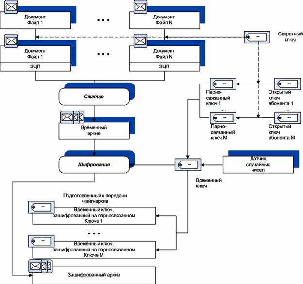 Организованный таким образом файл-архив можно передавать по сети без каких-либо опасений. При создании архива исходные файлы подписываются на секретном ключе (СК) ЭЦП абонента сети, после чего файлы сжимаются и получаемый в результате сжатия архив шифруется на случайном временном ключе. Абоненты, которым предназначается архив, могут расшифровать его с помощью записанного в архив зашифрованного временного ключа. Временный ключ зашифровывается на парно-связном ключе, вычисляемом по алгоритму Диффи-Хеллмана из СК отправителя и открытого ключа (ОК) ЭЦП абонента-адресата.