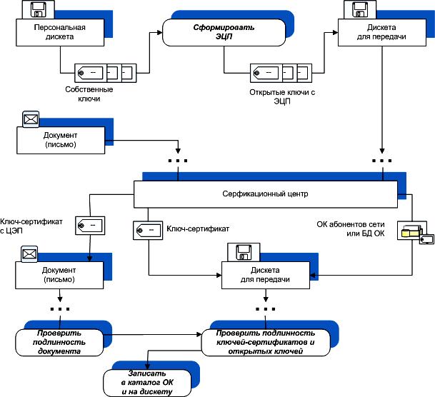 Таким образом, сами открытые ключи могут храниться в открытом виде, а персональная дискета, помимо СК владельца, должна содержать еще и ключ-сертификат.