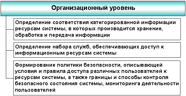 1. выработку политики информационной безопасности, определяющую какую информацию и от кого следует защищать; кому и какая информация требуется для служебного использования; требования к степени защиты для каждого вида информации; размеры ущерба от потери того или иного вида информации; организация работ по защите информации (см. рис. 2.1).