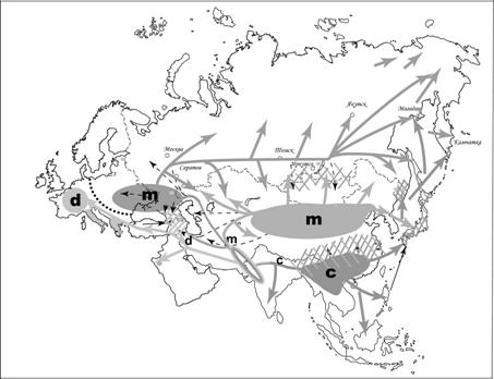 Рис.5. Схема расселения домовой мыши по территории Евразии.