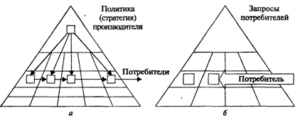 1. Вертикальная (рис. 5.4, а) — характерна для предприятий с авторитарным стилем управления, когда руководство "спускает" приказы отделам и подразделениям, работающим на потребителей. В этом случае цели и стратегии рассредоточиваются одним путем — сверху вниз. При такой политике не ясны и поэтому, как правило, из-за функциональных барьеров отсутствуют связи между целями на различных уровнях и запросами потребителей.