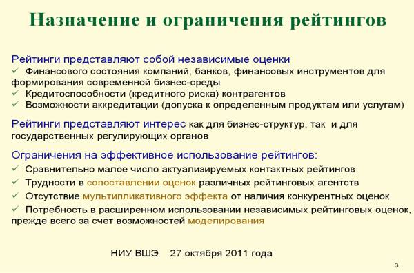 Рейтинги, как внешние, так и внутренние все чаще используются в системах риск-менеджмента. Назначение и ограничения рейтингов представлены на слайде 3.
