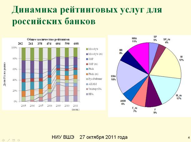Проведенный анализ показывает, что общее количество присвоенных основными агентствами банковских рейтингов, более 600. Российское рейтинговое пространство определяется не только международными агентствами, такими как Moody’s, Standard & Poor’s, Fitch, но и российскими (Эксперт РА, Национальное рейтинговое агентство (НРА), Рус-Рейтинг, AK&M). Доля российских услуг рейтинговых агентств превысило 40%. Распределение рейтинговых услуг между российскими и международными агентствами приведено на слайде 5.