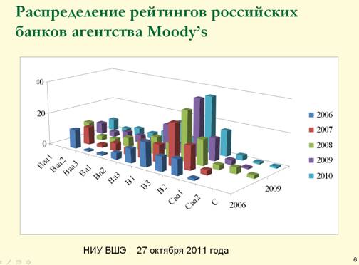 Уровень рейтингов российских банков по международным шкалам сравнительно невысок. Средний уровень рейтингов находится в интервалах ВВ - и ВВ для всех трех агентств. В условиях последнего кризиса, некоторым банкам и компаниям рейтинги были снижены на 1-2 градации. Распределение рейтингов агентства Mooduy’s во времени приведено на слайде №6.