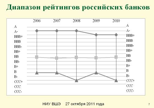 Максимальный уровень рейтингов банка составлял в 2006 г. А-, в 2010 г. несколько ниже – ВВВ+, минимальный уровень соответственно от В до ССС+, средний уровень стабильно ВВ, что совпадает с оценками международных рейтинговых агентств. Отечественные агентства играют значительную роль, но в своей нише.