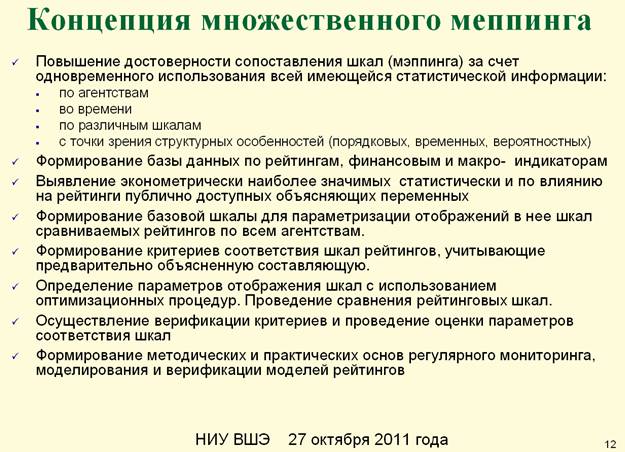 Рейтинги являются особым инструментом оценки рисков уже более чем столетие. При этом их роль не уменьшается даже в периоды кризисов, когда в силу специфики методологий некоторый дисбаланс в рейтинговых оценках вполне вероятен. Не случайно столь острым было обсуждение снижение рейтинга США, Греции, Италии и в настоящее время обсуждается вопрос снижения рейтинга Франции. Базельский комитет по банковскому надзору в документах Базель II и Базель III ориентирует финансовые организации и регулирующие органы на использование как внешних, так и внутренних рейтингов для анализа кредитных рисков эмитентов и инструментов.