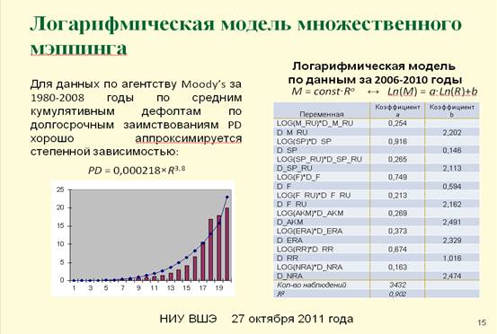 Анализ показал, что в качестве аппроксимации вероятностей дефолта по градациям рейтингов для агентств Moody’s и Standard & Poor’s могут быть использованы линейные комбинации логарифмической зависимости.