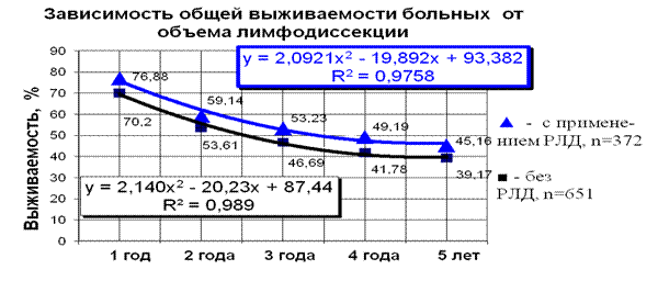 Во многих литературных источниках указывается, что наличие метастазов в регионарные ЛУ резко отрицательно отражается на отдаленных результатах с разницей в 5-6 раз. В то же время, наши исследования показали отсутствие такого большого различия: общая ПВ в группе из 562 больных без метастазов в ЛУ составила 52,31%, а в группе из 461 больного с метастазами в ЛУ – 27,98%, т. е. разница в ПВ составляет 1,87 раза. В группе больных, оперированных с использованием РЛД, соответствующие показатели были 61,08 и 32,2%, а без использования РЛД - 48,61 и 24,61%. По указанным данным видны преимущества РЛД и при отсутствии метастазов в регионарные ЛУ (61,08% против 48,61), и при их наличии (32,2% против 24,61).