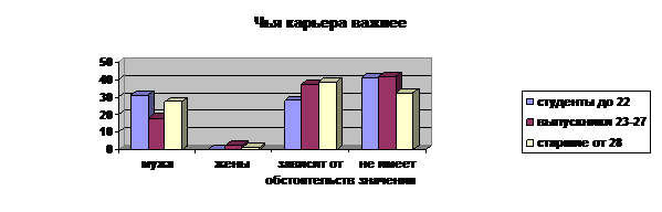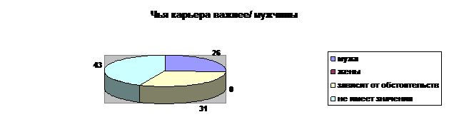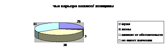 Представления респондентов о том, чья карьера важнее, свидетельствуют о наличии и устойчивости стереотипа о приоритетности карьеры мужа (25,5%). Однако люди руководствуются и реальными жизненными обстоятельствами, при которых в семье можно временно поступиться карьерой мужа в пользу карьеры жены, если необходимо (34,5%), а также развивать обе карьеры (38,5%).