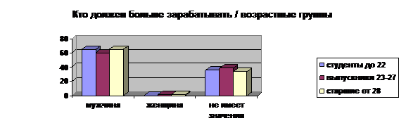Различия стереотипности гендерных представлений по возрастным группам в вопросе о гендерных ролях – основе экономической независимости мужчин и женщин – не значительны. Хотя можно отметить, что выпускников на 3,5% больше, чем студентов высказалось в пользу того, что не должно иметь значения, кто больше зарабатывает и на 5% меньше, что зарабатывать должен мужчина, соответственно. Приверженцами относительного гендерного равенства («не имеет значения») в вопросе желаемых доходов оказались 35,3% студентов, 38,8% выпускников и 33,8% людей старше 27 лет.