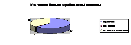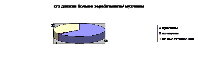 Казалось бы, общая картина свидетельствует о вполне модернистской тенденции – слабости стереотипа об исключительной важности карьеры мужа. Но ответы на вопрос, кто должен больше зарабатывать, продемонстрировали довольно традиционные представления респондентов: мужчина – 63 % (126), женщина – 1 % (2), не имеет значения – 36% (72). При этом императив долженствования (социального долга), присутствующий в формулировке вопроса, только подчеркивает традиционность респондентов в представлении о гендерных ролях.