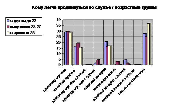 Возрастные различия в установках респондентов в реальной ситуации трудовой дискриминации женщин, показывают, что студенты, возрастная группа, не имеющая опыта работы, совместной жизни, детей, больше склонны осуждать дискриминацию - 60,3%. Чуть меньше показатель у «старших» - 58,5%. Наиболее нечувствительными к гендерной дискриминации и склонными ее оправдывать оказались выпускники, что вызвано их конкуренцией на рынке труда – только 31,3% осудили действия дискриминатора. Из них больше всего людей не просто оправдывает директора, но считает, что он прав – 13%; по сравнению с 9,2% - из «старших», 1,5% из студентов. Таким образом, сталкиваясь с реальностью рынка труда, молодежь склонна оправдывать и поддерживать дискриминационные практики. Кроме того, уровень рефлексии не позволяет им осознать связь между распределением ролей в семье, наличием детей и появлением гендерной дискриминации.