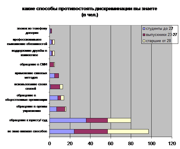 Студенты (81,8%) и «старшие» (92%) выбирали обращение к юристу почти как единственный знакомый им способ противостояния дискриминации. Выпускники, хотя также отдавали ему предпочтение (61,8%), но называли и использование собственных связей (26,5%) и обращение в вышестоящие органы власти (23,5%), что, в общем-то, не очень эффективно в таком случае и свидетельствует о том, что респонденты на самом деле не настроены на открытое противодействие и не имеют достаточной правовой культуры. В сравнении с более глубоким пониманием явления, отмеченным у выпускников, препочтенные ими способы свидетельствуют о сознательном выборе не преодоления, а обхода дискриминации или манипулирования ею.