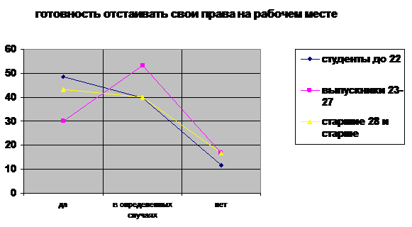 Существует зависимость от возраста готовности отстаивать свои права, или декларирования такой готовности. Доля студентов и старших, заявляющих о том, что они будут бороться за себя выше (41,8% и 43,1%, соответственно), чем доля выпускников (30%), которые предпочитают учитывать обстоятельства (53,3%).