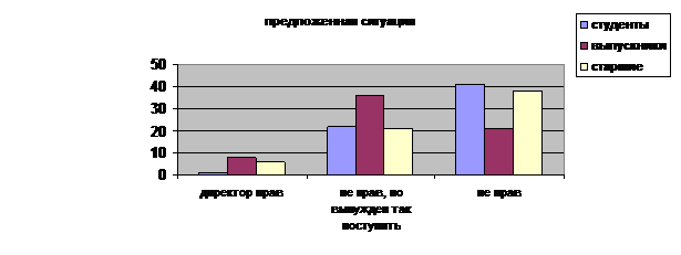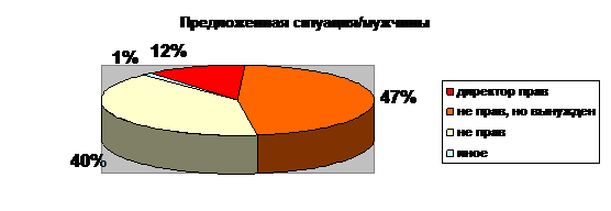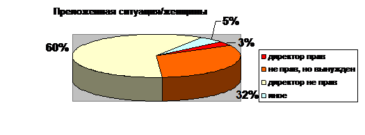 Распределение по полам в ответ на предложенную ситуацию еще больше показательно. Из тех, кто безусловно одобряет дискриминацию, 80% - мужчины и 20% - женщины. Из тех, кто считает оправданными действия директора, хотя признает его неправоту 60% мужчин и 40% женщин. Из противников случая гендерной дискриминации на стадии приема на работу 60% женщины и 40% мужчины. Сами потенциальные жертвы подобной дискриминации – женщины – в первую очередь считают, что директор нарушает закон и никакие экономические обстоятельства его не могут оправдать. 60% женщин и 40% мужчин осуждают дискриминатора; оправдывают его действия 60% мужчин и 40% женщин, из которых 12% мужчин и 3% женщин считают его совершенно правым.