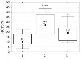 По частоте обострений в год пациентов разделили на 2 группы, сходные по поло-возрастному составу и длительности анамнеза. Первую группу составили пациенты с количеством рецидивов от 6 до 11 раз в год (n = 21), вторую — больные с непрерывно рецидивирующим течением заболевания (12 и более обострений в год; n = 28). У пациентов сравниваемых групп изменения параметров НСТ-теста были однонаправленными (повышение НСТб по сравнению с контролем; р = 0,02 и р = 0,005 соответственно) (рисунок 2). Однако степень изменения значений НСТб у больных с количеством рецидивов от 6 до 11 в год была значимо выше, чем у лиц с большей частотой рецидивов (170 и 100 % соответственно, р = 0,02).