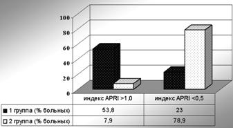 Как видно на рисунке 1, у пациентов 1 группы частота показателя индекса APRI более 1,0 (высокая вероятность значительного фиброза) была значительно выше, чем во 2 группе (р = 0,0014). У большинства больных 2 группы индекс был менее 0,5 (низкая вероятность значительного фиброза), различие также статистически значимо (р = 0,001).