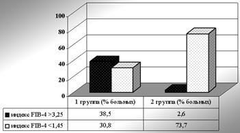 При сравнении частот вероятности значительного фиброза по индексу FIB-4 были получены похожие результаты. Значение индекса более 3,25 (вероятность значительного фиброза печени высока) намного чаще выявлялось у больных 1 группы (р = 0,0031), и напротив, значение индекса менее 1,45 (вероятность значительного фиброза печени мала) достоверно чаще (р = 0,015) обнаруживалось у пациентов 2 группы (рисунок 2).