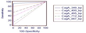 Как видно из таблицы 2, положительные результаты выявления сagA-генотипа, полученные всеми праймерами, составили 7 случаев при малоактивной форме, 7 — при умеренноактивной и 17 — при высокоактивной, то есть 31 случай выявления. При проведении анализа любой положительный результат учитывали как истинно положительный. Поэтому ложноположительные результаты приняты за 0, соответственно, и специфичность всех вариантов ПЦР (используемых праймеров) составила 100 %. Исходя из данных предпосылок сравнивали чувствительность праймеров для выявления CagA-генотипа при помощи программы «MedCalc».