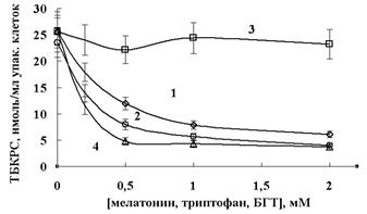 Рисунок 1 — Протекторный эффект мелатонина (1, 2), триптофана (3) или БГТ (4)