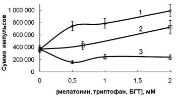 Рисунок 2 — Эффект мелатонина (1), триптофана (2) или БГТ (3) на люминол-зависимую