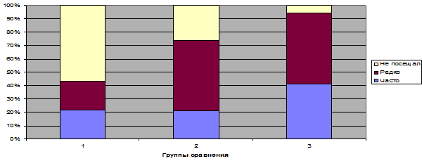«Пребывание в компаниях пьющих» наблюдалось в третьей группе у,1 %) из 17 пациентов против,5 %) из 23 пациентов первой группы (p < 0,001) и у,7 %) из 19 пациентов третьей группы (p < 0,001). Только 1 (5,9 %) из 17 пациентов третьей группы не посещал компании пьющих, что значительно меньше (p < 0,0001), чем среди пациентов первой группы, где не посещали компании пьющих,6 %) из 23 пациентов, и меньше (p < 0,001), чем во второй группе, где не посещали компании пьющих 5 (26,3 %) из 19 пациентов. Часто посещали пьющие компании 7 (41,2 %) из 17 пациентов третьей группы, что значимо больше (p = 0,01), чем среди пациентов второй и первой групп, где часто посещали компании пьющих 4 (21,1 %) из 19 и 5 (21,7 %) из 23 пациентов соответственно (рисунок 1).