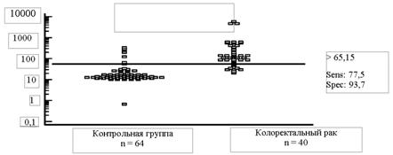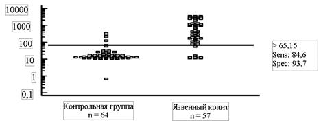 Для последующего анализа для фекального калпротектина выбрана точка отсечения на уровне 65,15 мкг/г. Она наиболее оптимально отражала соотношение чувствительности и специфичности.