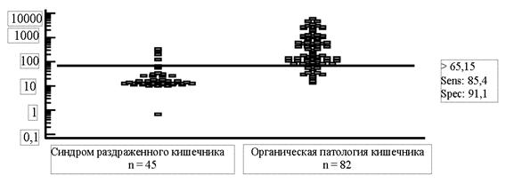 Положительная проба на основе определения фекального калпротектина выявлена у 70 из 82 пациентов с органической патологией кишечника, отрицательная — у 41 из 45 больных синдромом раздраженного кишечника. Различия между группами были статистически достоверны (р < 0,000001).