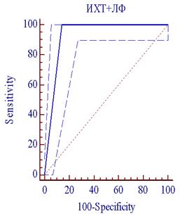 ROC-кривая диагностической значимости комбинированной пробы на основе определения фекального лактоферрина и иммунохимического теста на скрытую кровь в кале в выявлении язвенного колита представлена на рисунке 2.