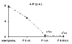 * - р<0,05 по сравнению со здоровыми; ** - р<0,05 по сравнению с F0 (критерий Крускала-Уоллиса, критерий Дана).