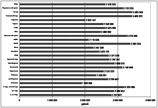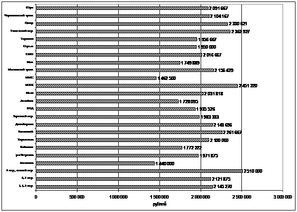 Самые дорогие трехкомнатные квартиры в центре, как и в апреле 2008 г., октябре и июле 2007 г., (5 рублей), самые дешевые, как и в июле и октябре 2007 г. на Мысу (2 рублей). На втором месте по цене за трехкомнатную квартиру можно расположить Тюменский мкр., ММС, затем МЖК и, средневзвешенная цена в этих районах достигает 4 , 4 466 667 и 4 рублей за квартиру соответственно, менее трех миллионов стоит квартира в р-не Воровского, на Войновке, в Тарманах, на Маяке, в Антипино, на Лесобазе и Мысу.