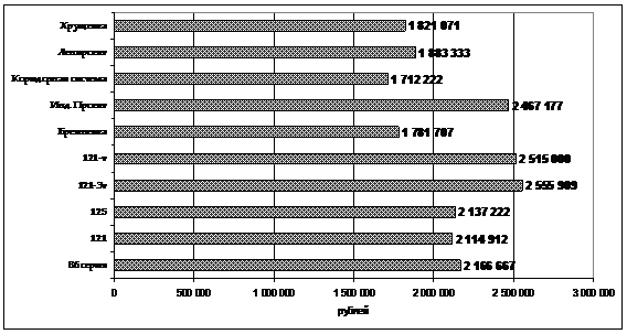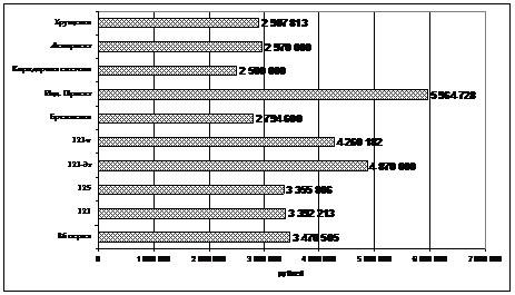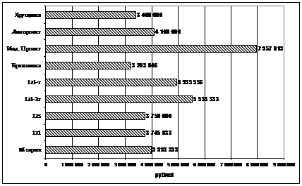 Как видно из диаграммы самым дорогим является «индивидуальный проект» (также как в июле и октябре 2007 г., а также апреле 2008 г.), однако средневзвешенная стоимость возросла с 3 787 124 рублей в апреле 2008 г. до 3 рублей в августе 2008 г., также как и в октябре 2007 г. и апреле 2008 г. более трех миллионов стоят квартиры 121-3т и 121-т серии. Цены на все оставшиеся типы домов находятся в диапазоне от двух до трех миллионов (аналогичная ситуация наблюдается в апреле 2008 г., а также в октябре и июле 2007 г.).