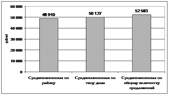 При анализе стоимости одного квадратного метра однокомнатных квартир были определены средневзвешенные цены в разрезе по районам, по типу домов и по общему количеству предложений.