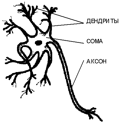 Нейроны крайне разнообразны по форме, которая зависит от их местонахождения в нервной системе и особенностей фунционирования. На Рис. 3.1. приведена схема строения "типичного" нейрона. Тело клетки содержит множество ветвящихся отростков двух типов. Отростки первого типа, называемые дендритами за их сходство с кроной раскидистого дерева, служат в качестве входных каналов для нервных импульсов от других нейронов. Эти импульсы поступают в сому или тело клетки размером от 3 до 100 микрон, вызывая ее специфическое возбуждение, которое затем распространяется по выводному отростку второго типа - аксону. Длина аксонов обычно заметно превосходит размеры дентритов, в отдельных случаях достигая десятков сантиметров и даже метров. Гигантский аксон кальмара имеет толщину около миллиметра, и именно наблюдение за ним послужило выяснению механизма передачи нервных импульсов между нейронами.