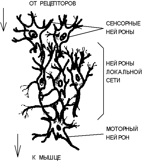 Сигнал внешнего раздражителя воспринимается сенсорными нейронами, связанными с чувствительными клетками-рецепторами. Сенсорные нейроны формируют первый (нижний) уровень иерархии. Выработанные ими сигналы передаются нейронам локальной сети, содержащим множество прямых и обратных связей с сочетанием дивергентных и конвергентных соединений. Характер преобразованного в локальных сетях сигнала определяет состояние возбуждения моторных нейронов. Эти нейроны, составляющие верхний в рассматриваемой сети уровень иерархии, образно говоря, "принимают решение", которое выражается в воздействии на клетки мышечной ткани посредством нервно-мышечных соединений.