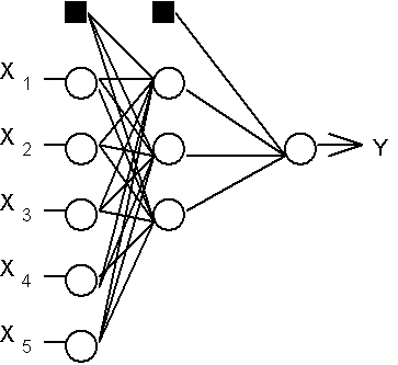 Рис.6.1. Структура многослойного персептрона с пятью входами, тремя нейронами в скрытом слое, и одним нейроном выходного слоя.